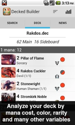 - Get statistics on your deck including mana curves, color symbol counts and card type percentages