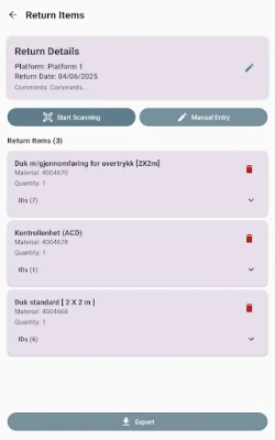 Designed for field teams, warehouse staff, and coordinators, the app simplifies tracking, scanning, and documenting equipment, both during dispatch and upon return.