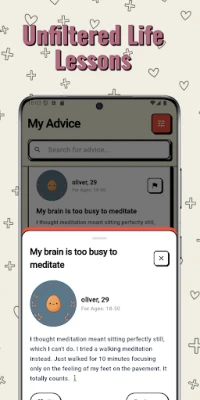 Welcome to My Advice-the anti-algorithm app. We connect you with a library of life experience, shared by older generations for you. No gurus, no fluff, just raw, honest wisdom from people who have actually lived it.